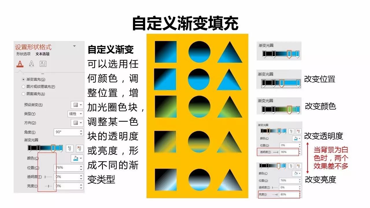 一般情况下,系统预设的渐变类型都太少,我们都采用自定义渐变填充,它可以随意设置颜色、调整位置、增加光圈色块,调整色块的透明度、亮度、类型、方向等,形式不同类型的渐变类型。