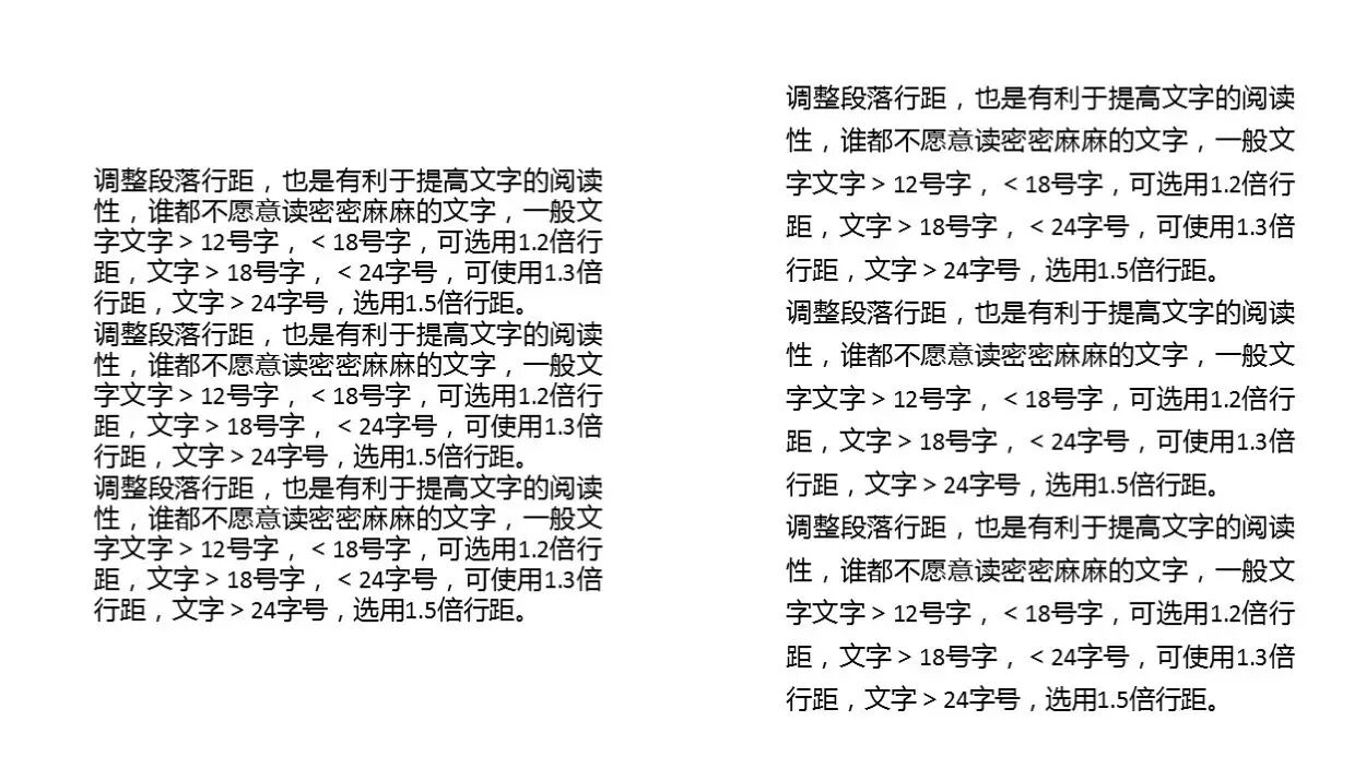 ③段落行距:调整段落行距,也是有利于提高文字的阅读性,谁都不愿意读密密麻麻的文字。一般文字文字>12号字,<18号字,可选用1.2倍行距,文字>18号字,<24字号,可使用1.3倍行距,文字>24字号,选用1.5倍行距。