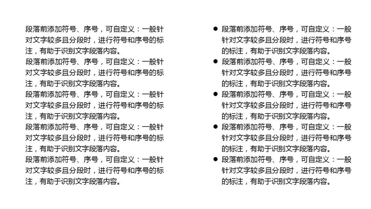 ①段落前添加符号、序号,可自定义:一般针对文字较多且分段时,进行符号和序号的标注,有助于识别文字段落内容。