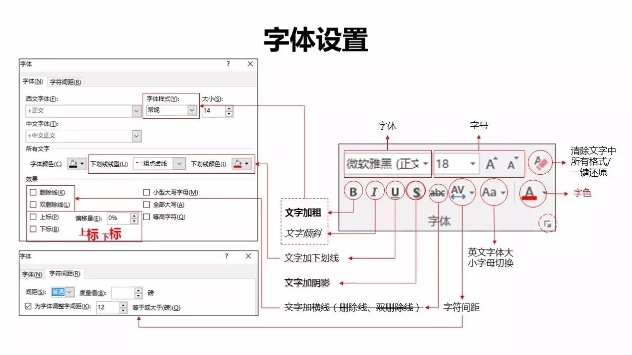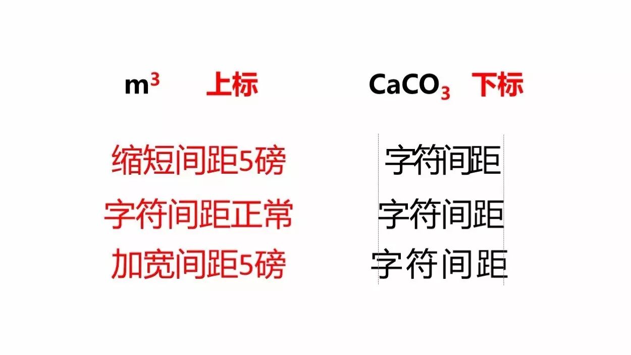 其中:上标、下标,是我们常做化学式和数学单位使用,字符间距是文字与文字之间的距离,其余均是图上标注的字面意思,无须多做解释。