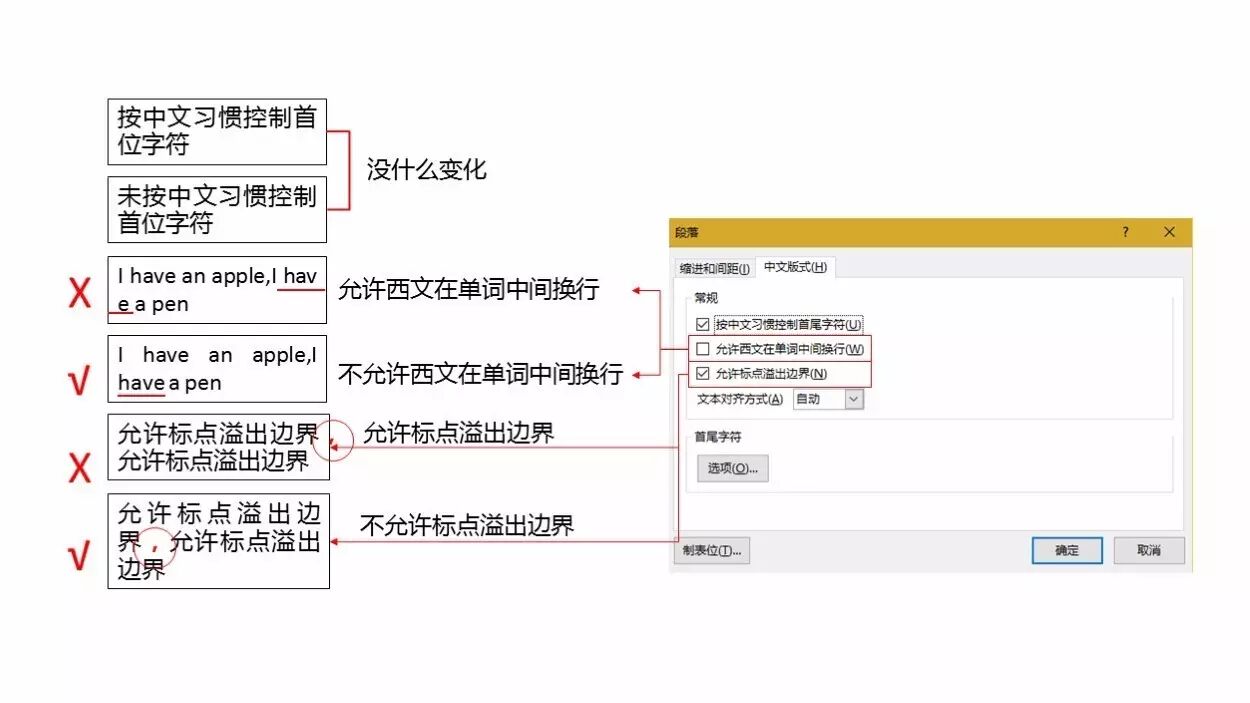 ⑥中文版式设置:按中文习惯控制首位字符、不允许西文在单词中间换行、不允许标点溢出边界。