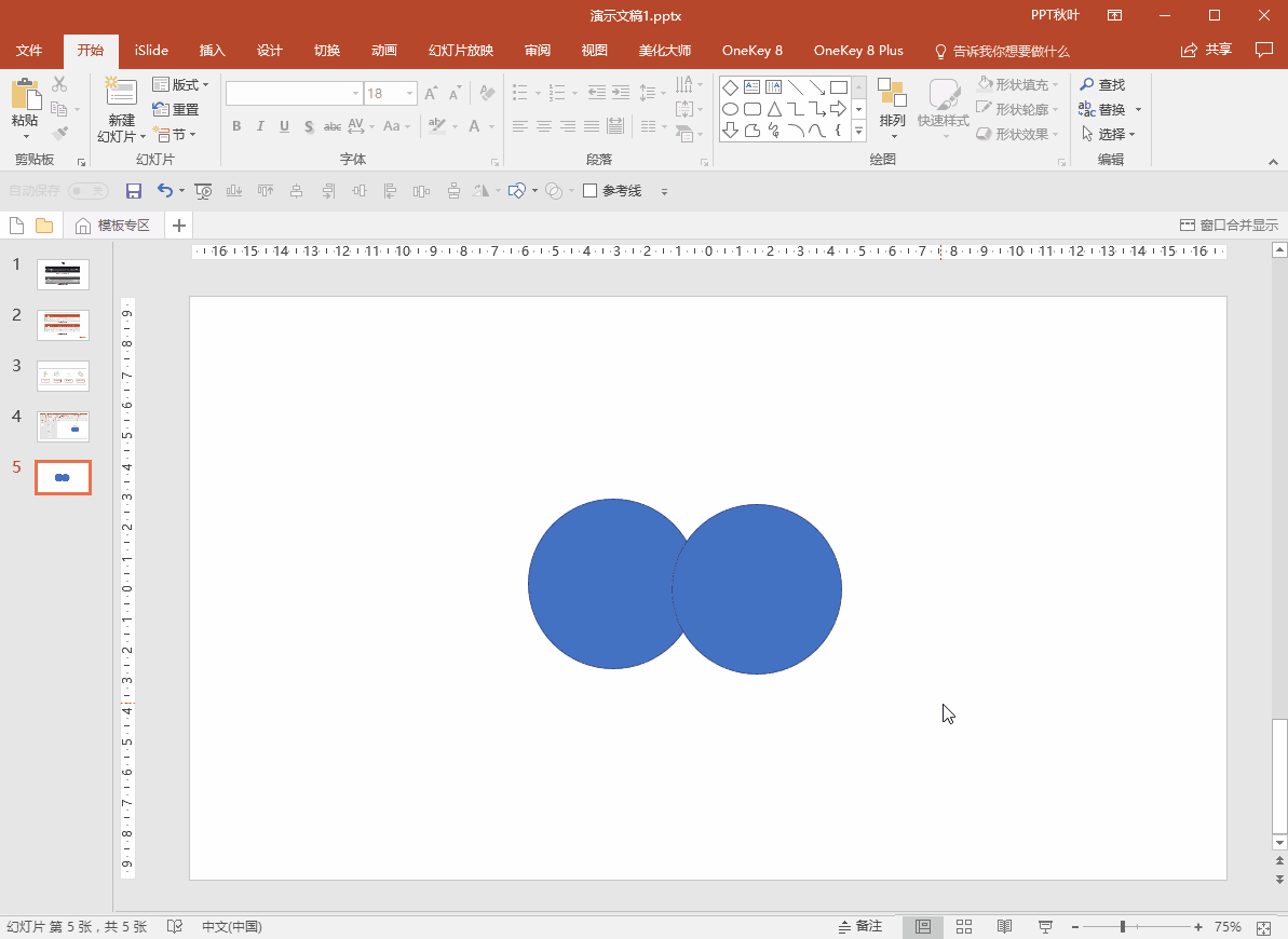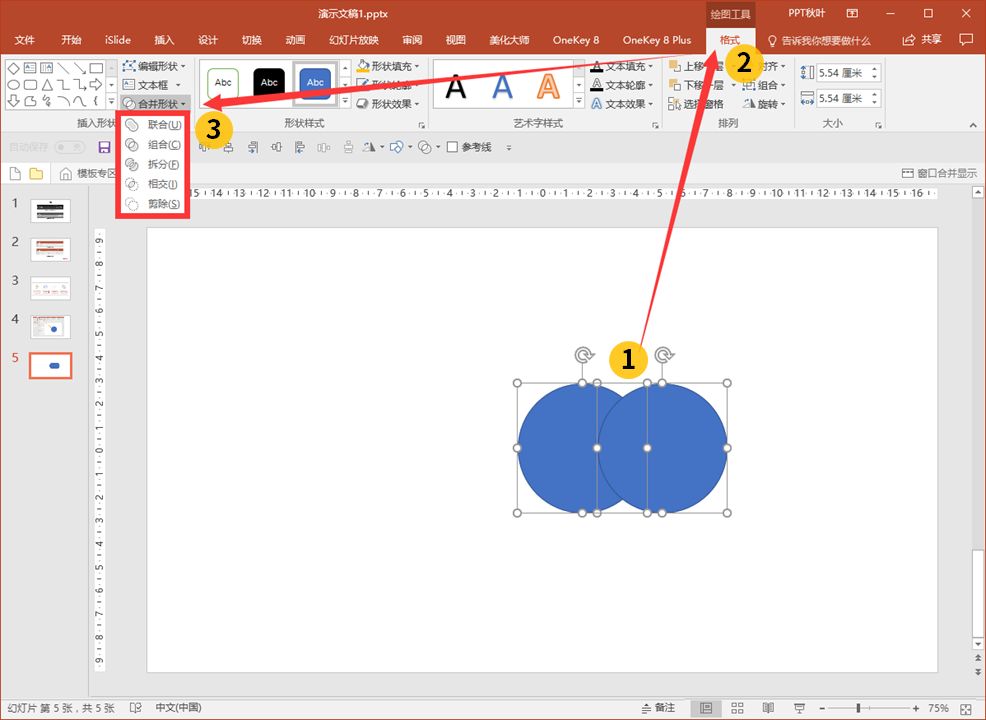 我们选中两个圆形,然后在「快速访问工具栏」中点击【合并形状】就完成了!非常方便!