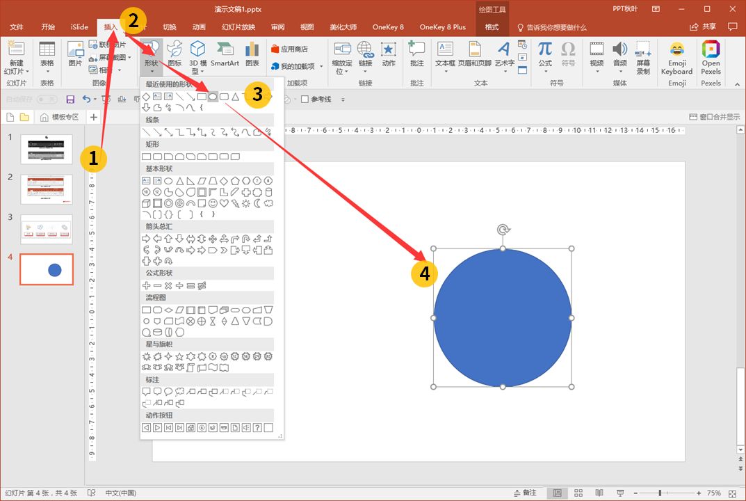 点击【插入】-【形状】-【圆】,然后在页面当中完成绘制。