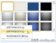 步骤2 单击功能区中的“设计”→“背景”→“背景样式”按钮,在打开的背景样式列表中右击要设置的背景,在弹出菜单中选择“应用于所选幻灯片”命令,如图9-30所示。