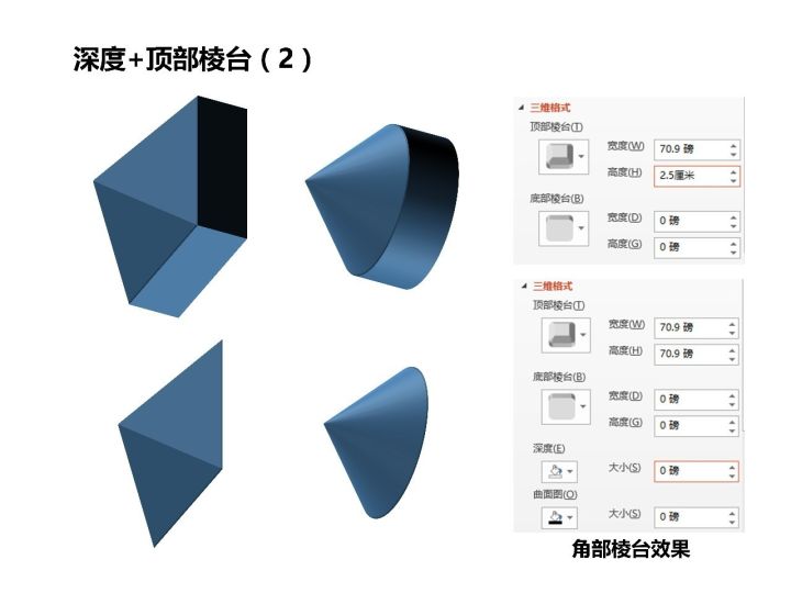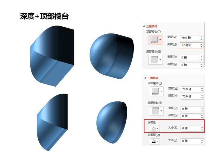 我们再把宽度和高度改为正方形边长和圆直径的一半,也就是2.5厘米——直接在宽度和高度里面带单位输入“2.5厘米“,PPT会自动转换为磅。这时候我们发现立方体顶部棱台各个面汇聚到中心点,而圆柱体的顶部棱台更是形成了一个半球。我们再把原来设置好的深度改为0,效果更加明显(图3)。到这里,我们应该清楚该如何绘制真正的球体(不是二维+阴影高光的那种)了:底部棱台和顶部棱台的宽度=高度=半径、深度为0即可。