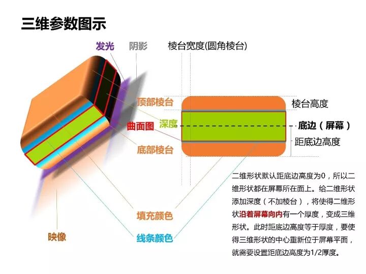 我们在上面图形的基础上再添加顶部棱台和底部棱台(宽度和高度都为6磅),此时可以看到添加棱台和添加厚度一样,都是以底边(屏幕)为基准面朝屏幕里面添加(图11)。