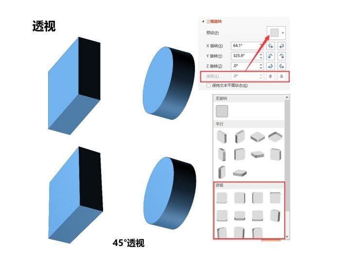 “透视”顾名思义,是为了让三维形状更加符合“近大远小”的实际视角观察效果。在PPT里面“透视”一开始是灰色的,不能直接设置。如果要激活透视效果,需要在预设中选择一个带透视的旋转效果(图15),图15选择了透视第二排第四个效果(45°透视),然后进行三位旋转,使其方向与原来没有透视的三维图形保持一致,便于我们对比透视效果。