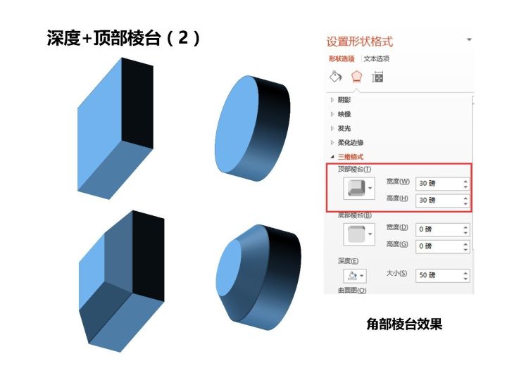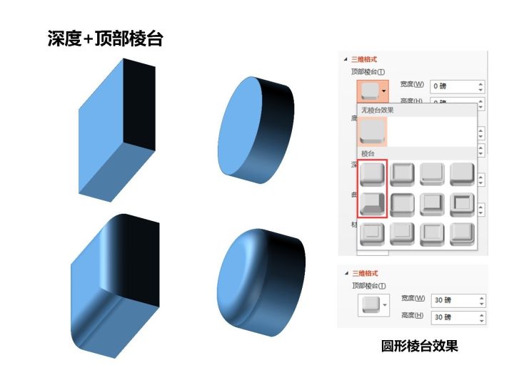 PPT里面提供的棱台有12种,我们这里只讲最简单的两种:圆形棱台和角部棱台,即图2右边红框所示,其他的大家自己试验。先对图1绘制的两个三维图形添加顶部圆形棱台(棱台第一排第一个),宽度和高度随便输入一个数值,这里为30磅,可以看到在原来立方体或圆柱体厚度的基础上多了一块弧度变化圆润的三维形状。