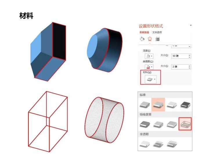 我们再看曲面图下面的材料和照明两个参数。材料主要是指为三维图形模拟各种材质,提供了三类效果:标准、特殊效果和半透明,如果对材质有要求,可以在里面寻找适合的效果,比如亚光效果、塑料效果、金属效果等等。比如,使用特殊效果最后一个线框效果,可以为一些零件展示结构示意图。