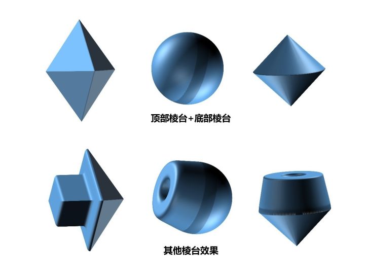 通过设置顶部棱台和底部棱台,一些常见有棱台的三维图形就可以绘制出来了(图6)。此外,PPT还提供了其他12种棱台效果,我把图6第一排的对称棱台图形顶部棱台随便选了几种效果(图6),剩下的其他效果有空不妨试一试,个人感觉PPT的棱台功能在工科专业绘制各种零件三维图非常方便。