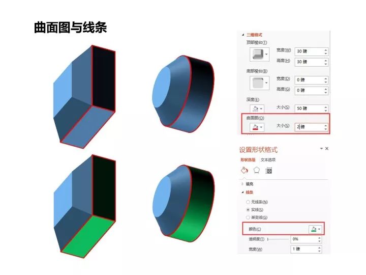 棱台及深度下面有个“曲面图”参数,我们把它设置为红色、2磅,发现在深度四周出现了红色边框线;而把原来正方形或者圆的边线设置为绿色1磅实线,则发现深度所在面有了绿颜色(图7)。