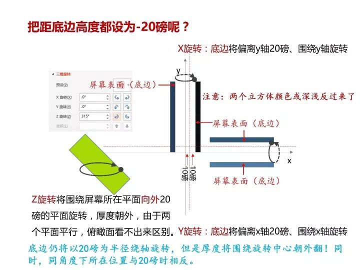 如果将距底边高度设置为-20磅,X旋转和Y旋转同样底边将偏离旋转中心20磅,围绕y轴和x轴旋转;但是,X旋转和Y旋转时,底边都是朝里的,厚度围绕旋转中心外翻,同时,立方体同角度下所在位置与正20磅时相反;Z旋转则相当于整个旋转面朝外移动了20磅并且厚度是向外翻的(图13)。图14要注意箭头所指示的边。