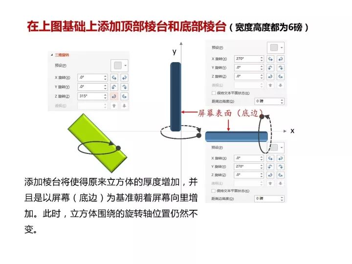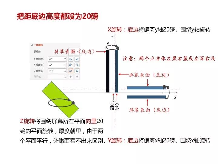 我们不添加棱台,仅仅将一个矩形添加深度10磅,对其进行旋转,这个时候发现X旋转是底边围绕y轴的、水平面内的旋转;而Y旋转则是底边围绕x轴的、垂直面内的旋转;而Z旋转则是围绕x轴和y轴所确定的面(即屏幕所在面)进行旋转(图10)。