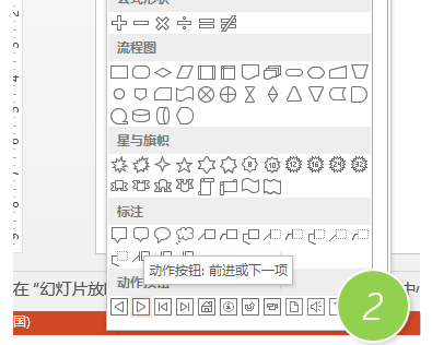 打开PPT,直接在最后一张幻灯片上插入一个动作按钮。(下图2处)。一般我们选“前进或下一项”动作按钮。