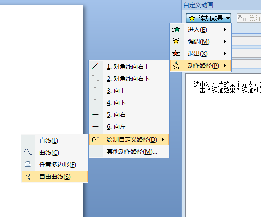 插入一张图片,选中图片后,单击“自定义动画”窗格中的“添加效果”按钮,在弹出的下拉列表中选择“动作路径”——“绘制自定义路径”——“自由曲线”命令。