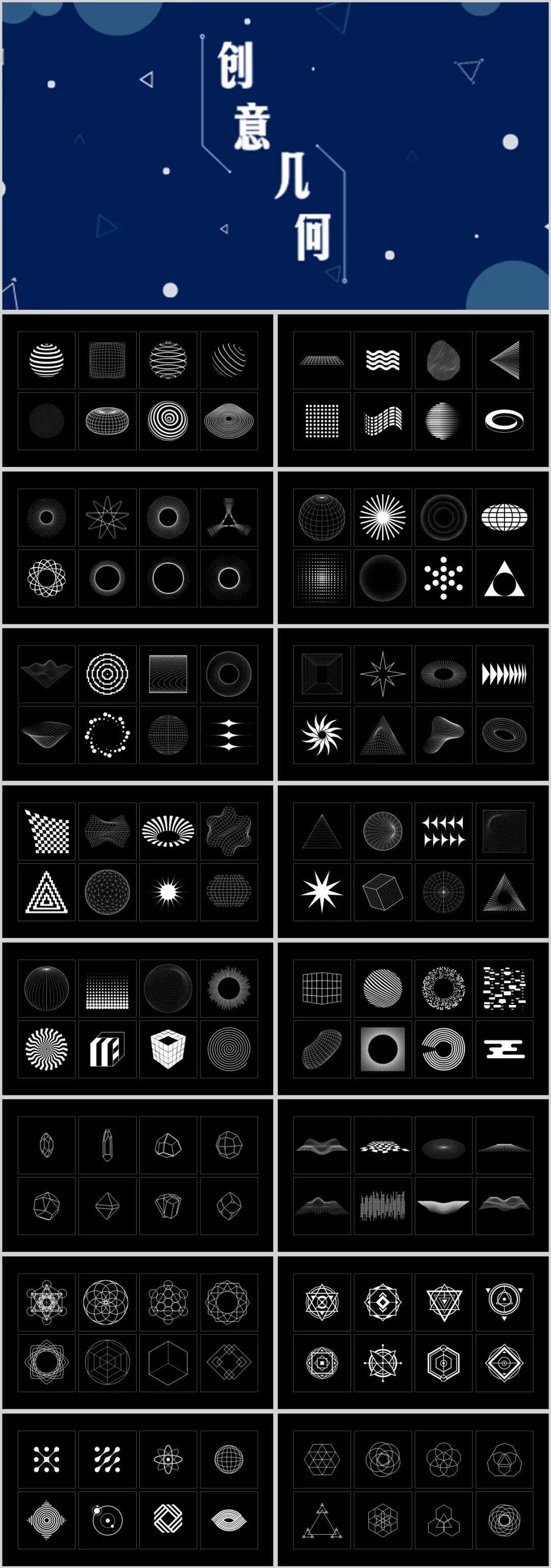 今天要跟大家分享一组创意几何的图形素材,同时也为了让大家可以更好地发挥创意,在你们日常PPT设计中能够用上这些素材,我也会抛砖引玉展示几个设计的案例。