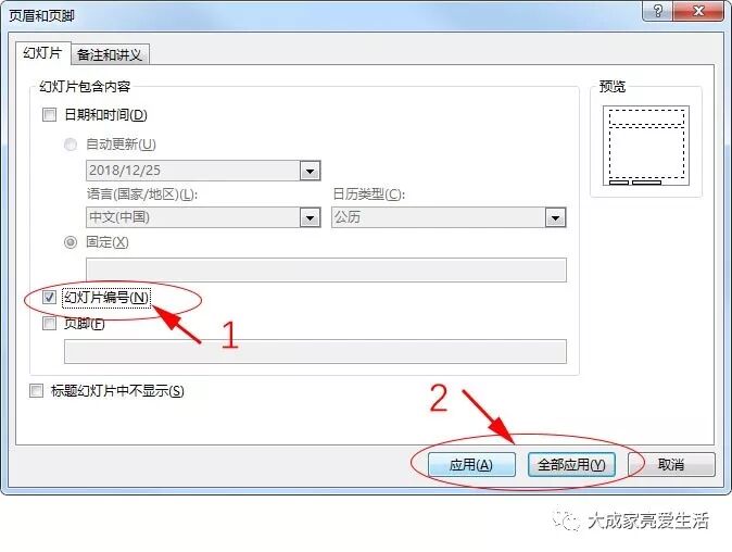 弹出“页眉和右脚”对话框,勾选“幻灯片编号”复选框。此时,如果点击“应用”,页码只出现在当前幻灯片上;点击“全部应用”,则每一页都显示页码。