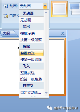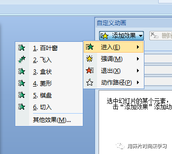 选中文字,选择动画选项卡中,动画选项组的自定义动画按钮。选择添加效果按钮,弹出的菜单中选择“进入”、“强调”、“退出”选项。