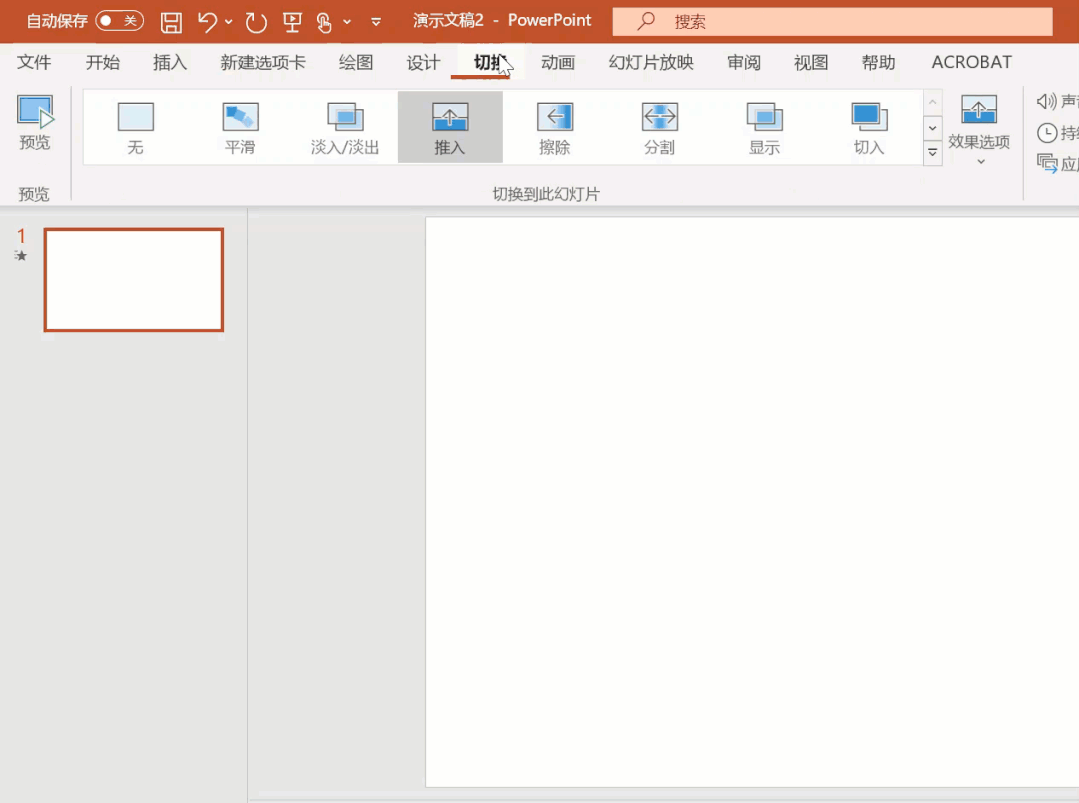 切换PPT的功能很好找,点击【切换】选项卡,可以看到很多的切换效果,点击【下拉菜单按钮】,可以看到更多选项。