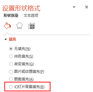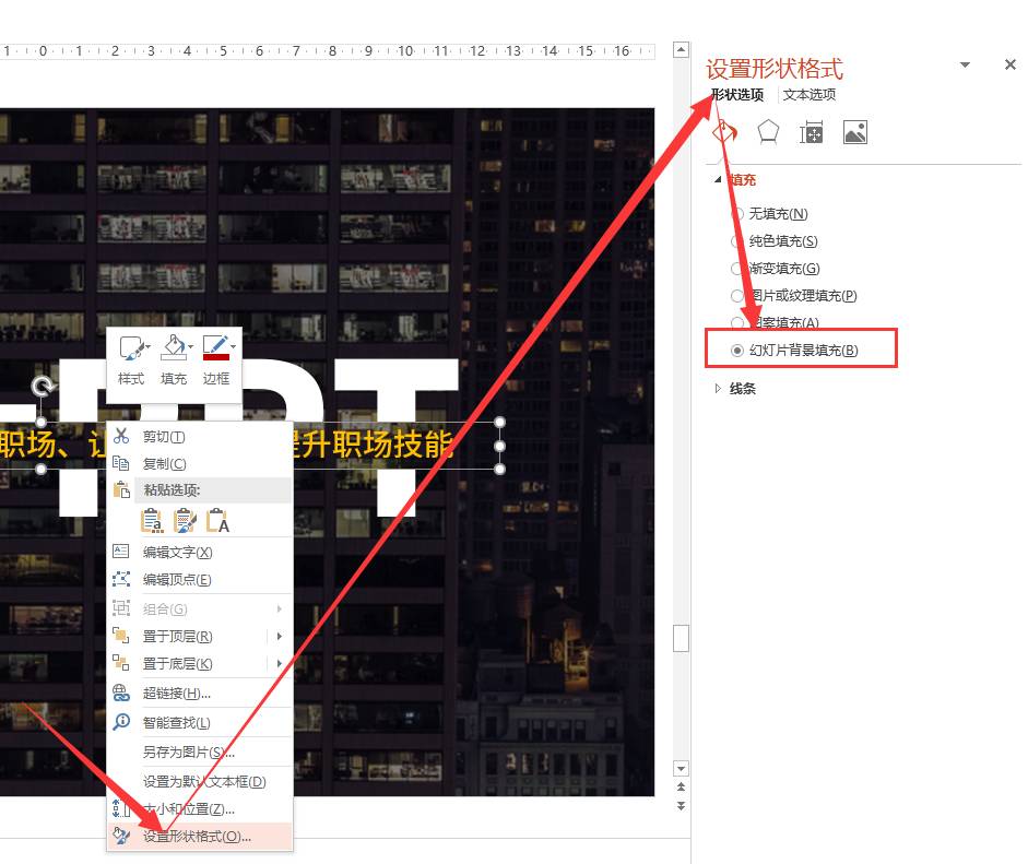 选中图中小字所在的文本框,右键点击并选择【设置形状格式】,在【填充】中选择【幻灯片背景填充】。