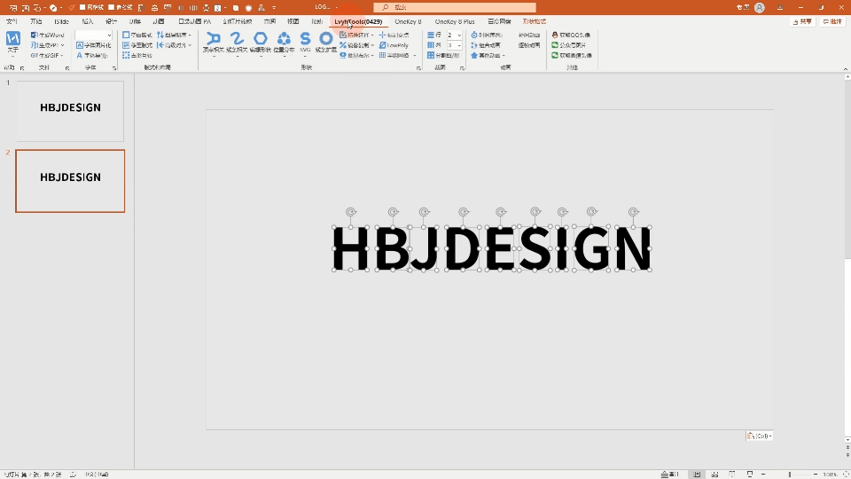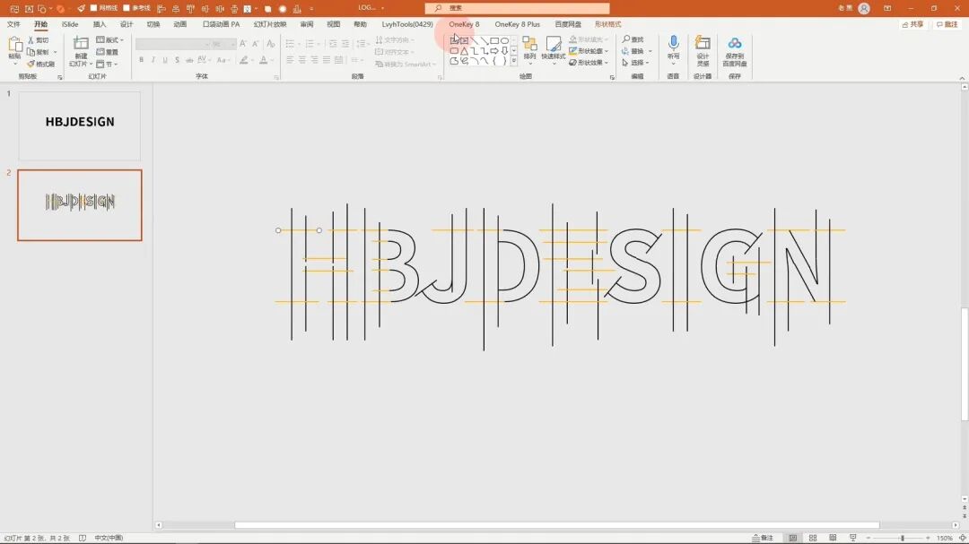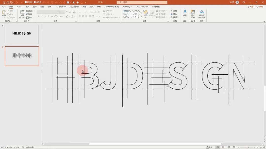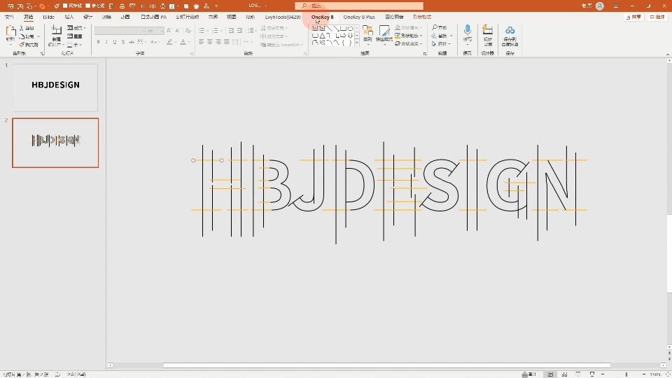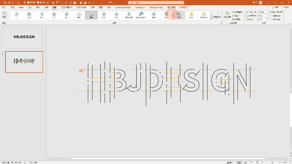 从线条绘制展现到完整作品, 这个过程本身有很强的设计感。 同时它也有介绍作品理念的实际作用。 所有操作都在PPT里完成的。 接下来详细讲解一下设计步骤。 制作思路和关键步骤 实现此动画的思路比较直观: 给LOGO的轮廓添加适配其走向的动画,例如横向线条可以添加横向的擦除动画,纵向线条可以添加纵向的擦除动画,圆形可以添加轮子动画。然后让完整LOGO在线条动画快结束的时候出现即可。 因此,提取LOGO的轮廓线和区分轮廓线的走向是两个关键技巧: 1、提取LOGO轮廓线 我用粗的黑体字写了一行文字。 然后随意绘制一个形状,选中文字再选中形状,运行合并形状下拉栏中的【拆分】命令,删除多余部分,文字就变成了形状。 在英豪插件的线条相关下拉栏中,点击【线条分段】,形状轮廓线就被打断了。 我们可以按住shift拖动控点延长轮廓线,如果遇到打断的曲线,就把整个曲线选中打组,重复这个操作就得到了所有延长了的轮廓线。 2、区分轮廓线走向 选中一条横向线条,修改颜色,然后使用格式刷将所有横向的线条都刷成这个颜色,这一步的目的是通过颜色手动给所有横向线条加了“横向”的标签。 选中一条横向线条,在Onekey插件的【特殊选中】下拉栏中,点击【按线条纯色】,所有横向线条都被选中了。 即可为它们添加【擦除】进入动画,方向设置为【自左侧】。 再选中所有的横向线条,点击【反选对象】按钮,就得到了所有纵向线条和曲线。 为它们添加向上的擦除进入动画,所有线条都有了动效,并且契合自身的走向。 3、拓展 我们可以将这个思路拓展到图形上。 很多LOGO都是多个基础形状布尔运算得到的。 因此这种动画的适用性很强。