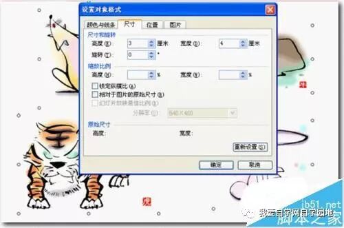 3、选中插入的十二张生肖图片,双击,进入“设置对象格式”对话框,单击“尺寸”标签,设置高度为3厘米,宽度为4厘米,如图所示,单击“确定”按钮完成设置