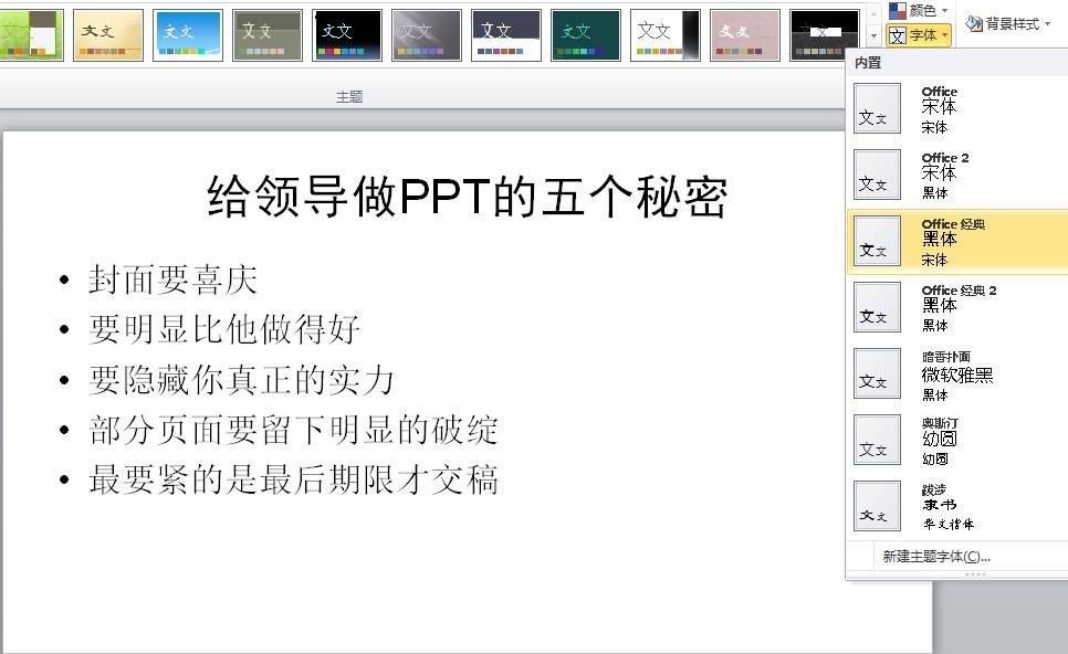 有时候PPT设计者会希望将整个PPT文档中的所有文字统一成某类制定字体,这种全局性更改字体的需求在许多时候可以通过【主题】中的【字体】来实现。