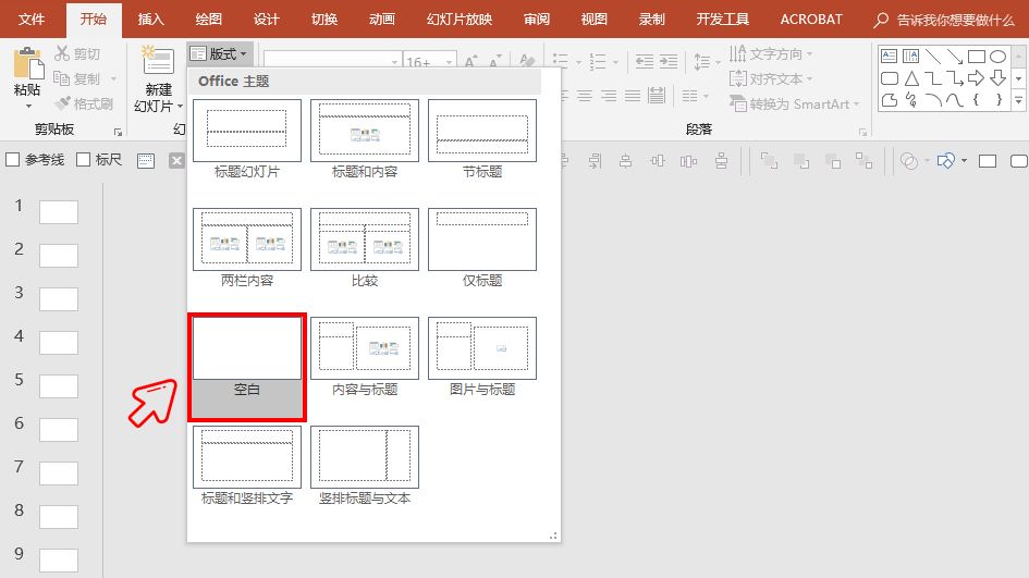 操作步骤:在【开始】选项卡中,在【版式】里选择【空白】,这样新建的页面默认都是空白的啦~