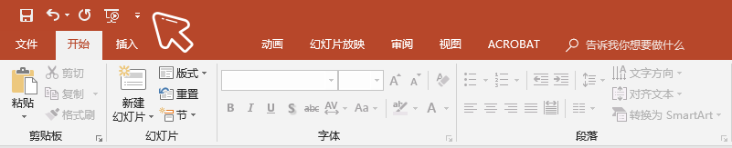 如果说其他的默认设置仅仅是锦上添花,那快速访问工具栏可以让你的效率得到质的飞跃。一般默认的快速访问工具栏在左上角这里,就是孤零零的这四个功能:保存、撤销、恢复和从头开始播放。