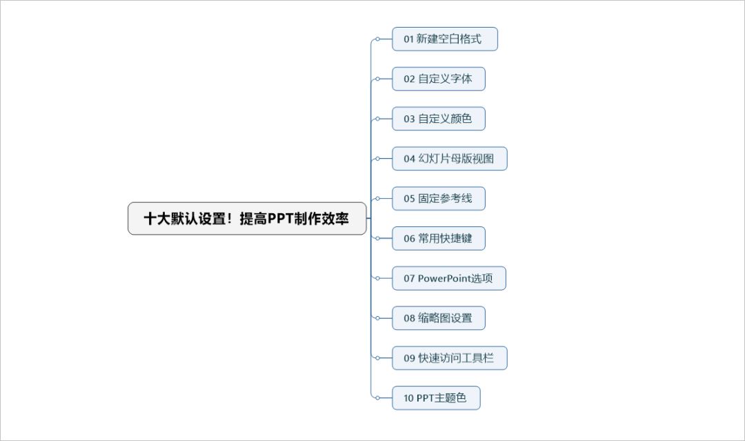 本文就跟大家分享下PPT的十大默认设置~话不多说,咱们就直接进入主体啦~本文思维导图如下:
