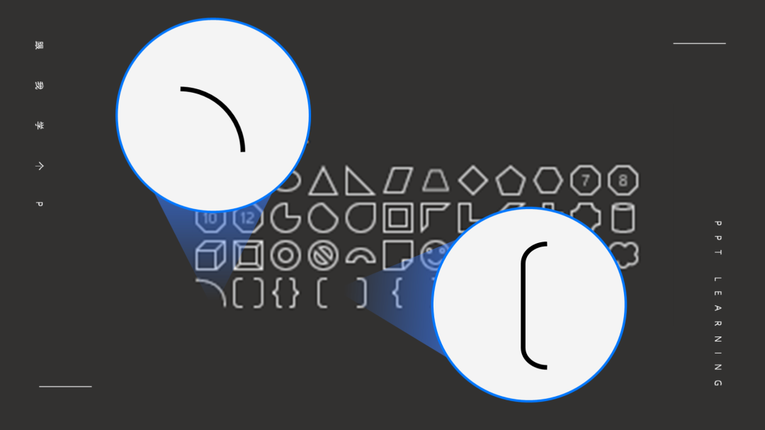 而曲线效果,则是用PPT里自带的【弧形】线条,或是【左/右中括号】形状跟普通直线拼接而成的: