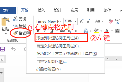 右键单击某个按钮,再选择“添加到快速访问工具栏”就可以了,以“格式刷”为例