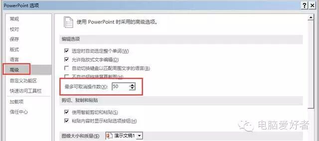 2、接下来选择【高级】这一栏,接着在把可撤销的次数改成自己需要的次数,最后按【确认】就OK。