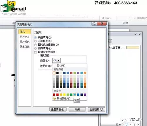 5、设置持续时间为5秒,右键单击从下拉菜单中选择设置背景格式选项,将背景设置为浅蓝色。