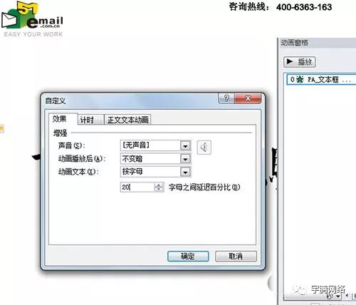 4、调出动画窗格,双击动画调出自定义对话框窗口,设置效果里动画文本为按字母,字母之间的延迟百分比为20%。