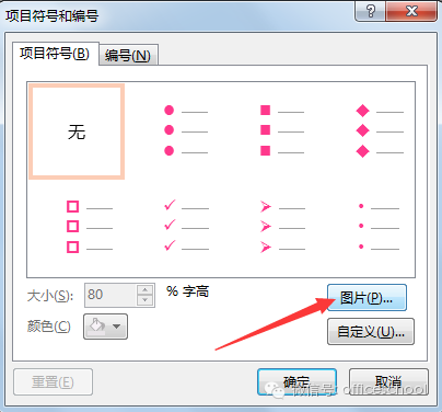选中文本---开始选项卡---项目符号---项目符号和编号---图片---插入图片—确定。
