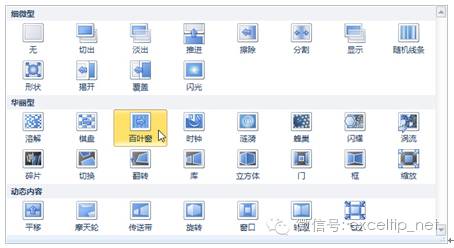 步骤1 选择要设置切换动画的幻灯片,然后打开功能区中的“切换”→“切换到此幻灯片”库,选择如图7-1所示的幻灯片切换动画,名为“百叶窗”。