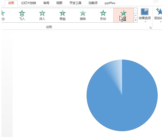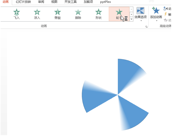 该动画的效果是是以圆形为中心,进行圆周的现实,是非常适合饼形或圆形等对称图形的动画设置。