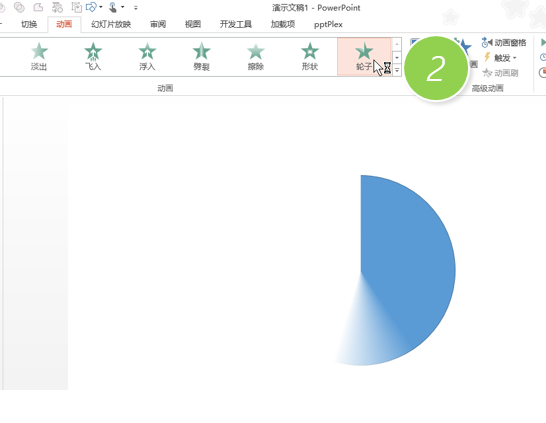 然后在“动画”选项卡中找到“轮子”动画效果,设置上去即可。如(下图 2 处)所示。