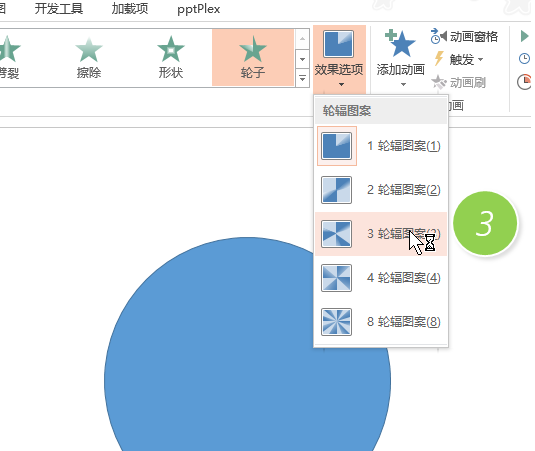 总结:PPT的动画设置相对而言简单快捷。如果对轮子的做深入研究,比如单击下图的选项效果按钮。(如下图 3 处)