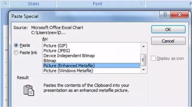3. 我们在Excel中复制单个图表,回到powerpoint,但是不要直接粘贴,而是用paste special,然后选picture (enhanced metafile) 或者picture (windows metafile)