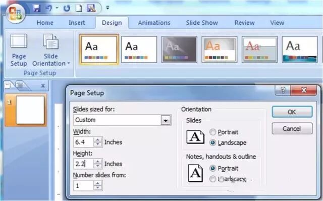 1. 首先要决定图版的大小,这需要综合考虑每个图表多大能让读者看得清楚,以及期刊对图版的尺寸的要求。在我们的例子中,我们希望每个图表是3英寸宽,2英寸高,左右排列,这样最终的图版我们可以设成6.4*2.2 inch. 新建一个powerpoint文件,layout设成空白,在Design/Page setup处设置slide size为6.4*2.2,方向为landscape。