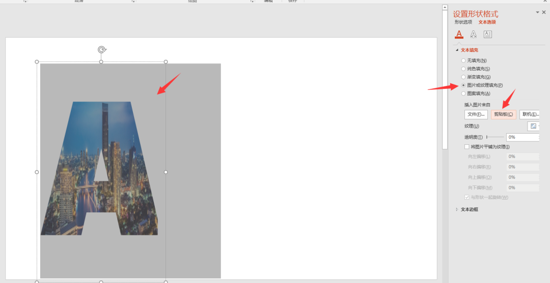 メ选择文本填充——图片或纹理填充——剪贴板。メ