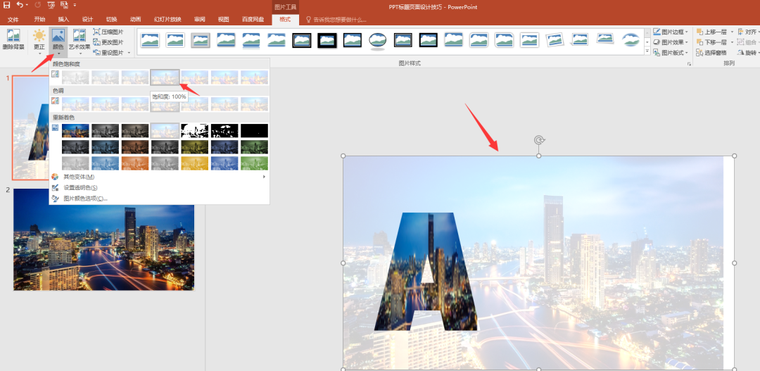 メ我们把图片页面拖动到文字下方形成背景——格式——颜色——饱和度100%。メ