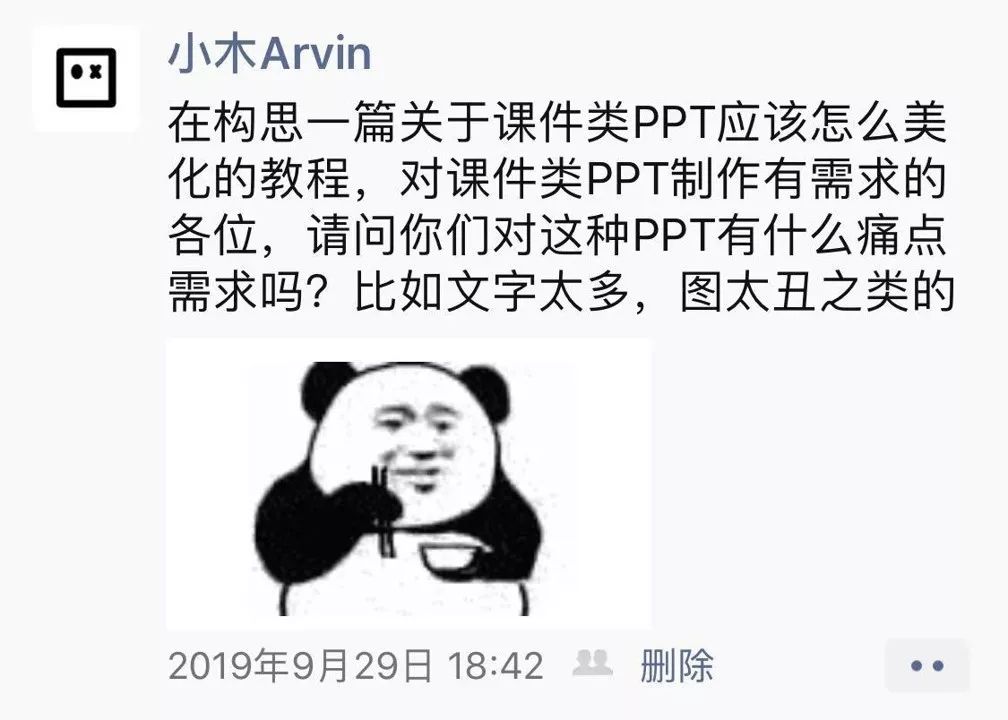 在写这篇教程之前,我发过一条朋友圈,询问了大家在制作课件类PPT时有什么痛点:
