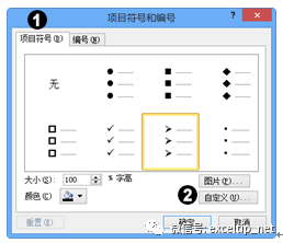 除了选择PowerPoint预置的项目符号外,还可以自定义项目符号的外观。单击“项目符号”按钮右侧的三角,在打开的列表中选择“项目符号和编号”命令,打开“项目符号和编号”对话框,如图3-117所示。