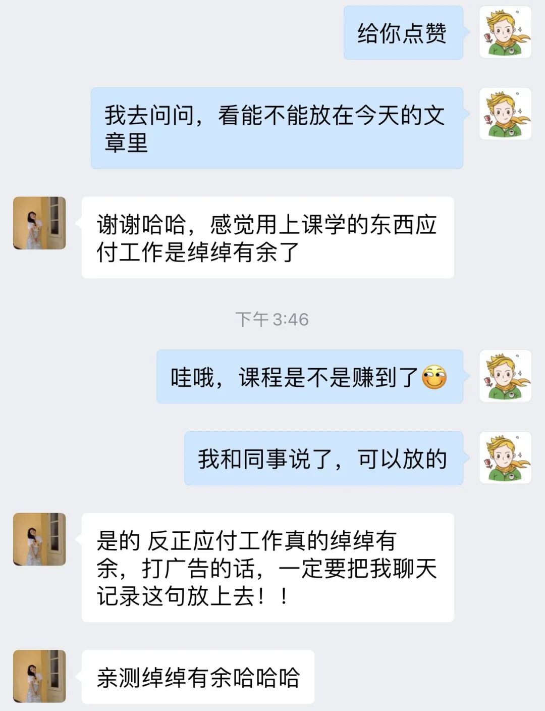 她最可爱的一面是,不仅强烈的表达了对课程的认可,还要求放上和她的聊天截图,她要为为课程打广告!