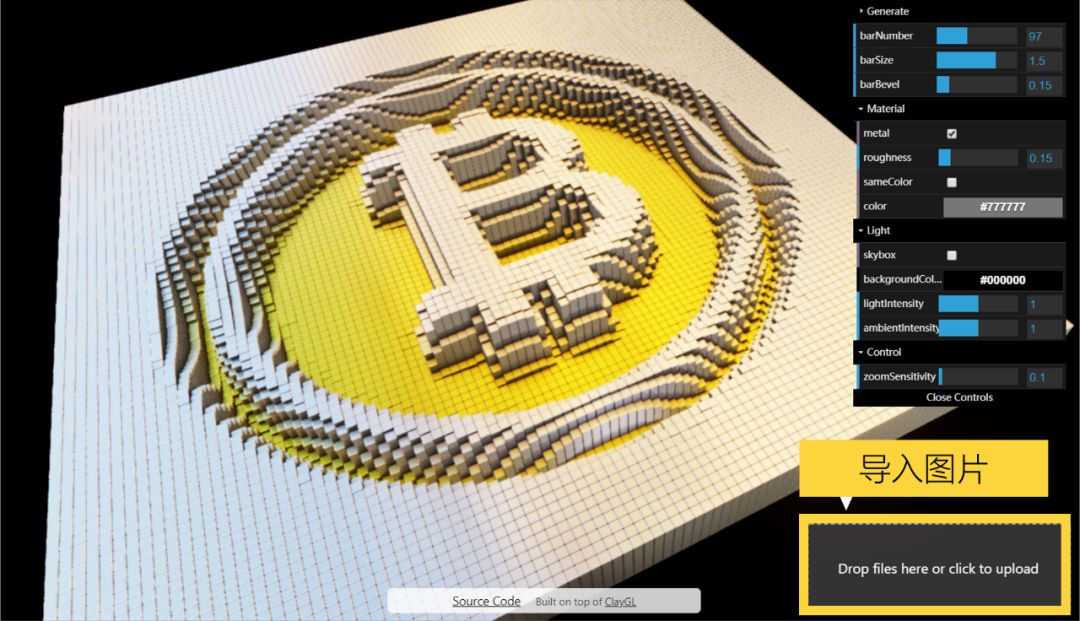Voxelize Image 十分简单易用,你只需要往右下角的方框拖拽一张图片,它就会自动把图片转换成这种立体的体素效果: