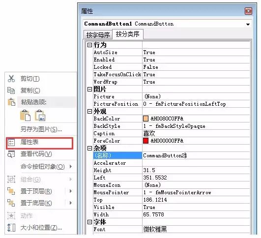 选择“Label21”标签,右击“属性表”,点击“按分类序”设置按钮的外观,参数如下: