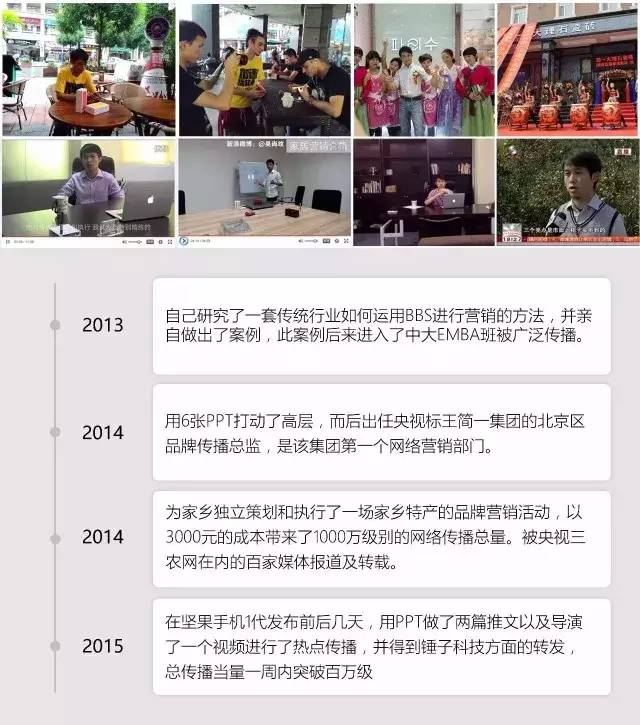 前不久我的朋友David辞职了,理由是“干的活再多,和每天磨洋工的人拿一样的工资,领导看不到我的成绩”。我问他,有没有和上司沟通过工作内容?——没有。 有的职场人每天工作十分努力,天天加班到深夜,但是工资很低,公司也不给机会升职加薪,这让他们特别焦虑。我问他们,有没有把项目进度和取得的成绩及时跟领导汇报?——没有。 很多人说,每次推进新项目的时候,自己特别努力,自己辛辛苦苦摸索好几天,公司却没有给到他相应的支持,结果不尽人意。我问他们,有没有主动向领导提需求?——没有。 得到的答案统统都是“没有”。 在职场中,除了踏实肯干,掌握合适的沟通技巧也是非常重要的,只有这样工作效果才会事半功倍。今天给大家分享一个最简单实用的小技巧,把工作沟通难度降到最低——做好工作汇报PPT。 自己找的工作 跪着也要把工作汇报做完 很多人对待工作汇报,都是应付完事。甚至连PPT模板都懒得更换,每次都将内容随意粘贴进去。而没有考虑到的是,PPT制作的是否精良,会很大程度上影响领导对你工作成绩的认可程度。一份好的工作汇报PPT,才可以更好的把核心信息展现出来,否则只是暴露你的缺点而已。 为什么我的眼里常含泪水 因为我对ppt爱得深沉 ... 我们都无法否认,现代职场人,和PPT的联系越来越紧密。 工作上:创业融资、商业提案、作图、工作汇报等少不了它; 生活中:利用它自行设计日历&贺卡、发个极具个人风格的邮件等,也可以说是非常有创意了。 工作那么忙,哪有时间专门学习PPT啊? 我叫Steven,一名被学生称为最暖心最特别的PPT老师(脸红)。我进入商业型PPT教育领域已经快三年了,见过面的学生数千不止,网上直播教过的更是数以万计。今天我要来告诉你一点内幕,就是如何学习PPT才能真正的超越我。 闲话不说,先用作品来做个自我介绍: (Steven的部分PPT作品) (在视觉设计方面,Steven还懂一点手绘) (然后,还懂一点点产品设计,这也是Steven的作品) 看到这里你也许觉得我是个还算不错的设计师,但我自己是不承认的,尽管是我毕业于世界50强的莱佛士设计学院…(第二次害羞)。其实我更多的身份是品牌和营销方面。 下面是我的一些该领域的小事件: 反正,最后Steven是把这样的设计跟这样的营销给高度的柔和在一起,变成了一样东西,那就是——商业PPT 。 作为一名别人眼中的PPT大神 我想教你如何快速超越我 “Steven你都这样了,我们如何超越你啊?” 首先,我要告诉你,一个老师如果教出来的学生都是比自己差的,那这个人真不是一个好老师。而且,我说让你超越我,我是有慎密的思考的,如下3点就是我给你总结出来可以超越我的方法论。 1、不要再把PPT当成设计工具了,它只是一个演示沟通的工具 很多人学习PPT就是大量的学习各种设计技法,乐此不疲的模仿套路。可是最终做PPT时发现不管如何做,你还是做得不如人家的好看。 这当然啦,你把PPT当成设计工具,那你就等于把自己当成设计师来培养,可想而知这难度,再说了,你真的有那么多的精力和耐心把自己从0开始学成设计师么? 有那时间,你不如好好打磨一下你的本职专业。所以,你跟我比的不是设计。工作型PPT的设计,我把你短期内教到70分就足够有余了。 2、学透PPT最本质的结构化呈现,返璞归真打败形式酷炫派 我在大学里讲课面对一群尚未踏入职场的大学生,我总是会先问一句话:“你学PPT是要让你的同学舍友们拍案叫绝,还是要让你的上司和客户拍案叫绝?” 我只想第二种需求的学生。显然,你的老板和客户是不可能因为你这个画面很酷炫而被你说服的。说服对方的永远都是你表达的内容有条理有逻辑。这一点我帮助你学透了,然后你在你的专业领域里又比我擅长,于是这一个领域里的PPT你就做得比我好了。 3、锁定一两种场景需求,深耕逆袭超越大神 基本上,专业的PPT老师和制作团队面对的场景和需求都是比较广的,因为这是职业需要。 尽管如此,有些老师是比较偏向发布会类型的,有些是比较偏向大学生基础教育的,有些是偏向工作型的,竞争力也因此而来。 同样的,你学习PPT到底是为了解决哪几个具体的场景和需求?这几个场景需要的懂得东西有哪些?然后你再去学好这几样其实也就成精英了。 很多人没想清楚这一点,就盲目买了很多课程,报了很多培训班。学习还是应该以终为始的,对吧? 那么,我会把工作型PPT里面该学的核心和基础都少而精的快速教给你,然后再告诉你一个积累的方向和方法,假以时日,你在这一两种精准的场景上做的PPT,肯定是要比我好的。 按照这个说法,不光是我,PPT大神堆里任何一个人都是可以被你超越的。那么以后当你的老板要来找我做PPT定制的时候,你就可以很骄傲的告诉你的老板:“在这个方面,我的PPT做得比Steven要好,不信你可以去问他。” 所以综上所述,小编认为通过一个短期的训练,超越Steven是完全可行的。 说那么多,我们如何开始第一步? 这次我总结了许多商业型PPT更加核心的方法论,能够跟大家进行一次深度交流。 如果对我的商业型PPT课程有兴趣,不妨来学习,实现职场能力的跃迁。 由于我接触PPT和大多数人一样都是因为工作,当时没有系统的教程,只能靠自己的摸索,去学习一些设计的理论。后来使用PPT的次数多了,越来越熟悉它,同时我也发现在文案、审美以及逻辑思维的能力上,有很大的提升。尽管如此,我还是走了很多的弯路